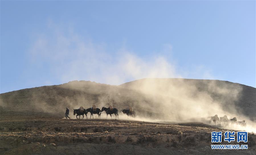 12月6日,騾馬隊馱負(fù)工程物料前往山頂塔基施工現(xiàn)場。新華社記者李楨宇攝