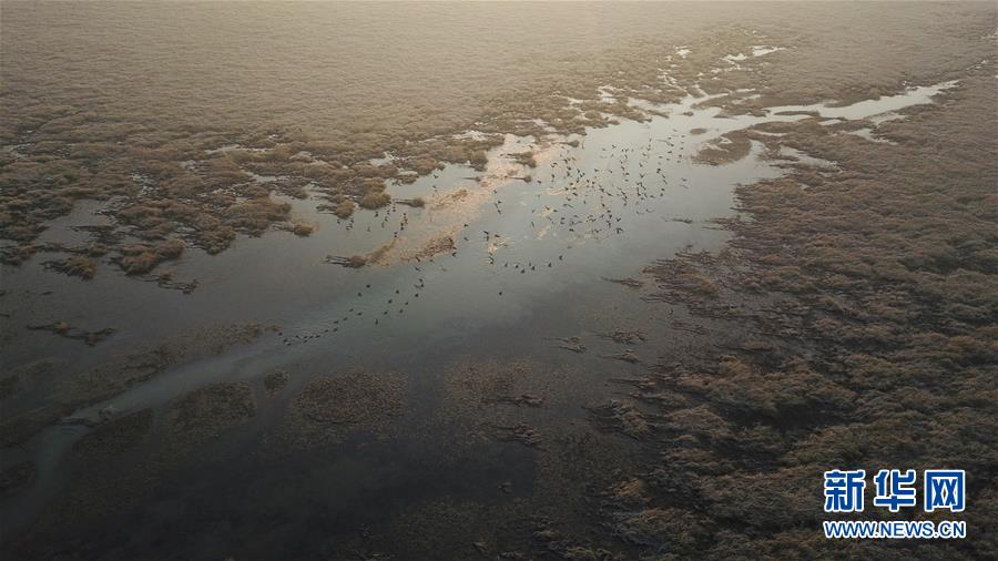 12月7日,一群候鳥在升金湖停留(無(wú)人機(jī)拍攝)。新華社記者張端攝