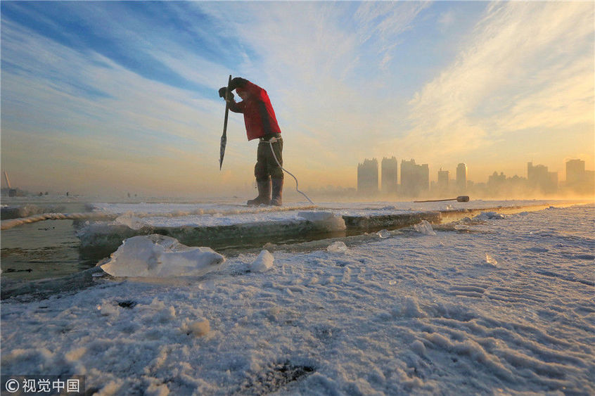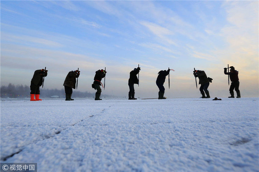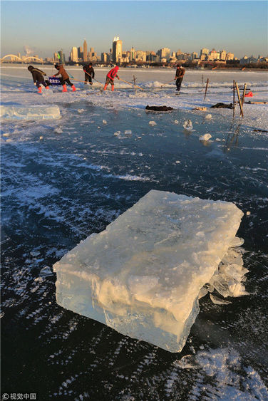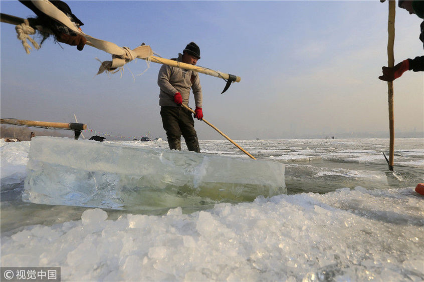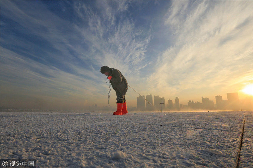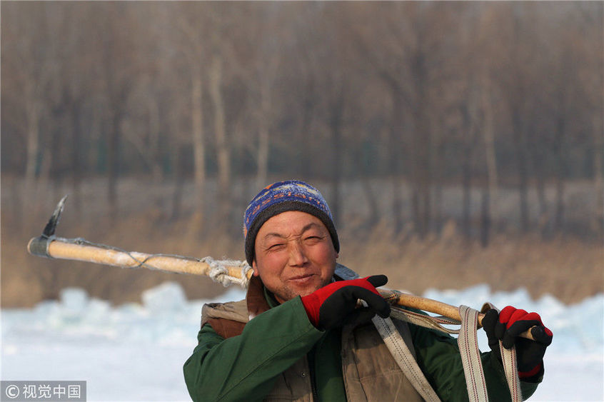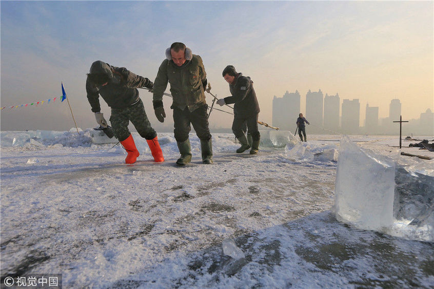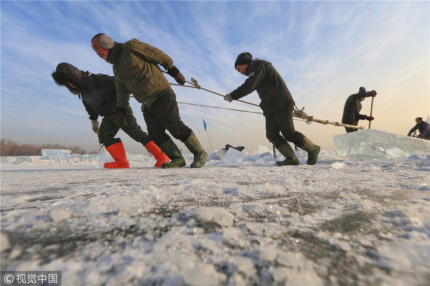 2018年12月11日,黑龍江省哈爾濱市,松花江上,采冰者們彎腰拉繩,宛如纖夫般拽重達(dá)半噸的冰塊出水。采冰者都是自哈市江北萬(wàn)寶、東發(fā)、沙陀子等鄉(xiāng)鎮(zhèn)的農(nóng)民,他們每年冬閑時(shí)都會(huì)親屬、村鄰之間結(jié)伴到松花江畔采冰,有的采冰人,已經(jīng)連續(xù)干了二十多年。每個(gè)采冰季,他們每天要在冰面上工作10-12個(gè)小時(shí),每個(gè)采冰組,一天要拽出冰塊2000-3000塊,一個(gè)近20天的采冰季,每人能收入近萬(wàn)元。視覺(jué)中國(guó)