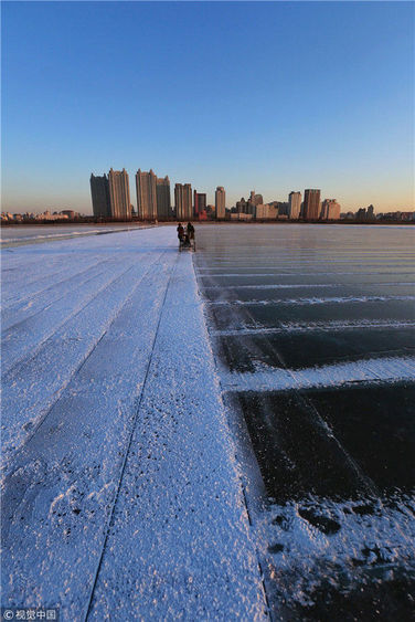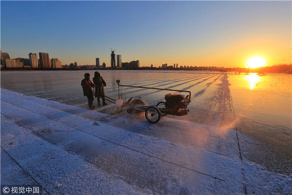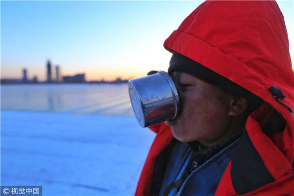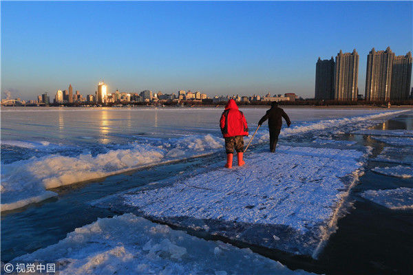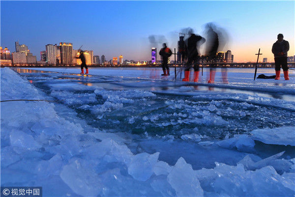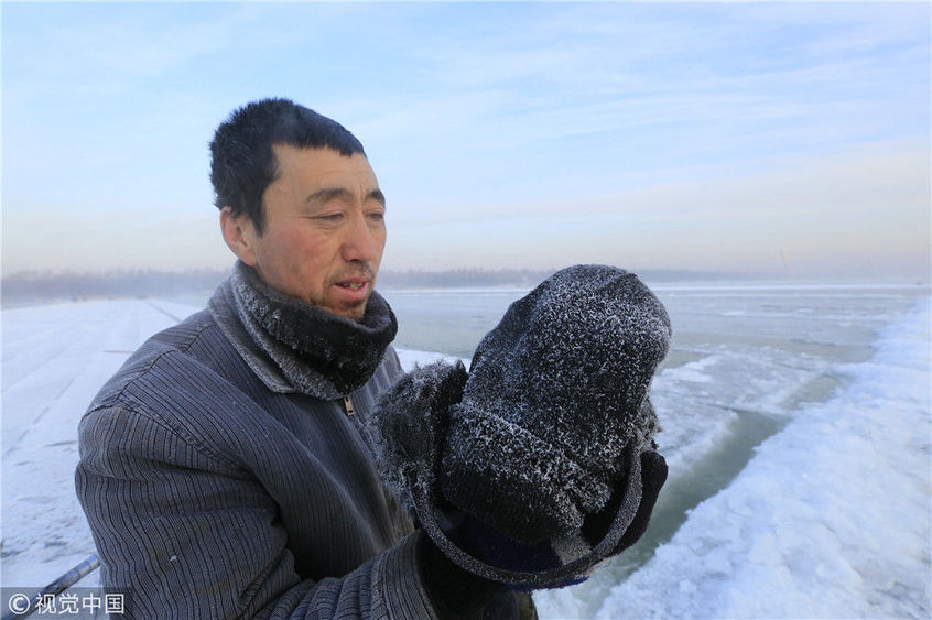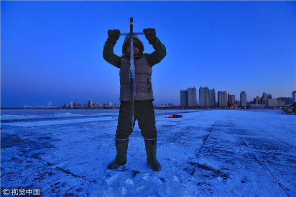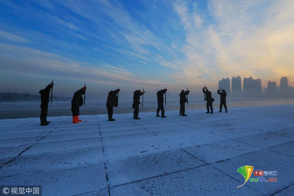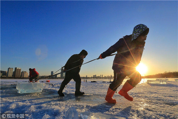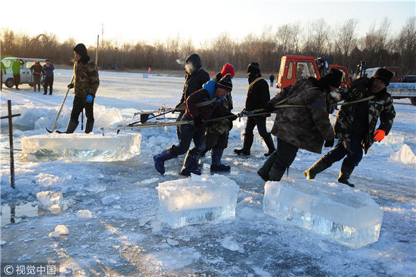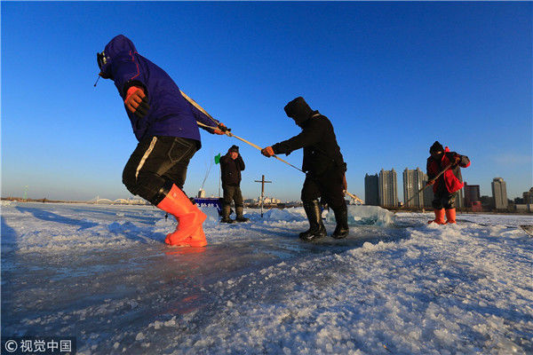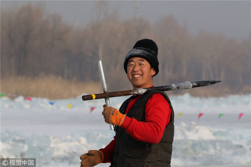 2018年12月11日,黑龍江省哈爾濱市,松花江上,采冰者們彎腰拉繩,宛如纖夫般拽重達(dá)半噸的冰塊出水。采冰者都是自哈市江北萬(wàn)寶、東發(fā)、沙陀子等鄉(xiāng)鎮(zhèn)的農(nóng)民,他們每年冬閑時(shí)都會(huì)親屬、村鄰之間結(jié)伴到松花江畔采冰,有的采冰人,已經(jīng)連續(xù)干了二十多年。每個(gè)采冰季,他們每天要在冰面上工作10-12個(gè)小時(shí),每個(gè)采冰組,一天要拽出冰塊2000-3000塊,一個(gè)近20天的采冰季,每人能收入近萬(wàn)元。視覺(jué)中國(guó)