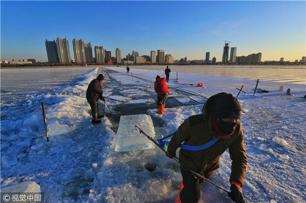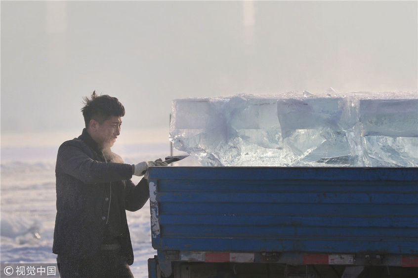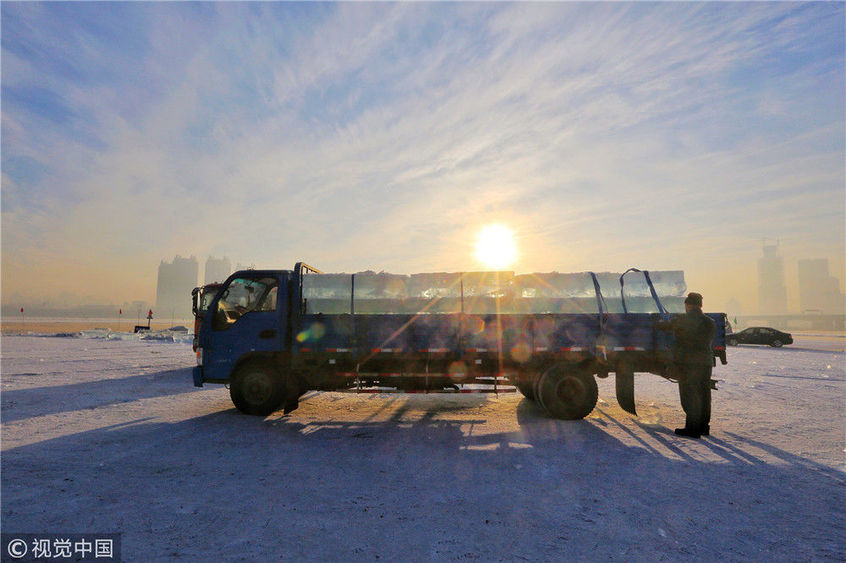 2018年12月8日,最低氣溫零下22度,哈爾濱市江北公路大橋東側(cè)的江面上,工人們正在從江中撈取冰塊,裝車(chē)運(yùn)往景區(qū)制作冰燈、冰雕。現(xiàn)場(chǎng),工人先是用電鋸、鐵釬將冰分割成半米多寬,一米多長(zhǎng)的冰塊,接著將其拉出水面。等候在旁的叉車(chē)上前,將冰裝上運(yùn)冰的卡車(chē),之后裝滿(mǎn)冰塊的卡車(chē)駛往景區(qū)。