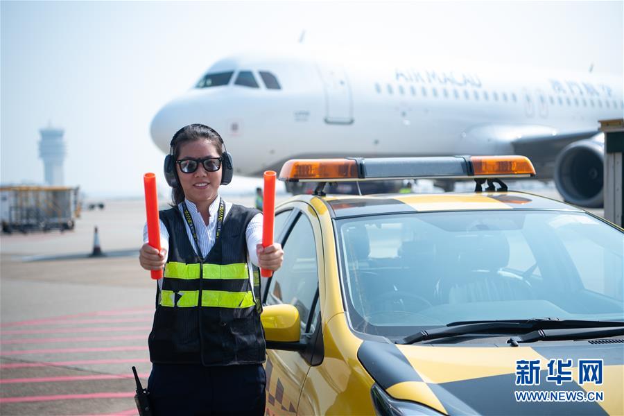 11月25日,澳門(mén)國(guó)際機(jī)場(chǎng)營(yíng)運(yùn)員鄧祺君在機(jī)場(chǎng)指揮飛機(jī)停泊,她已經(jīng)工作了3年。 新華社記者 張金加 攝