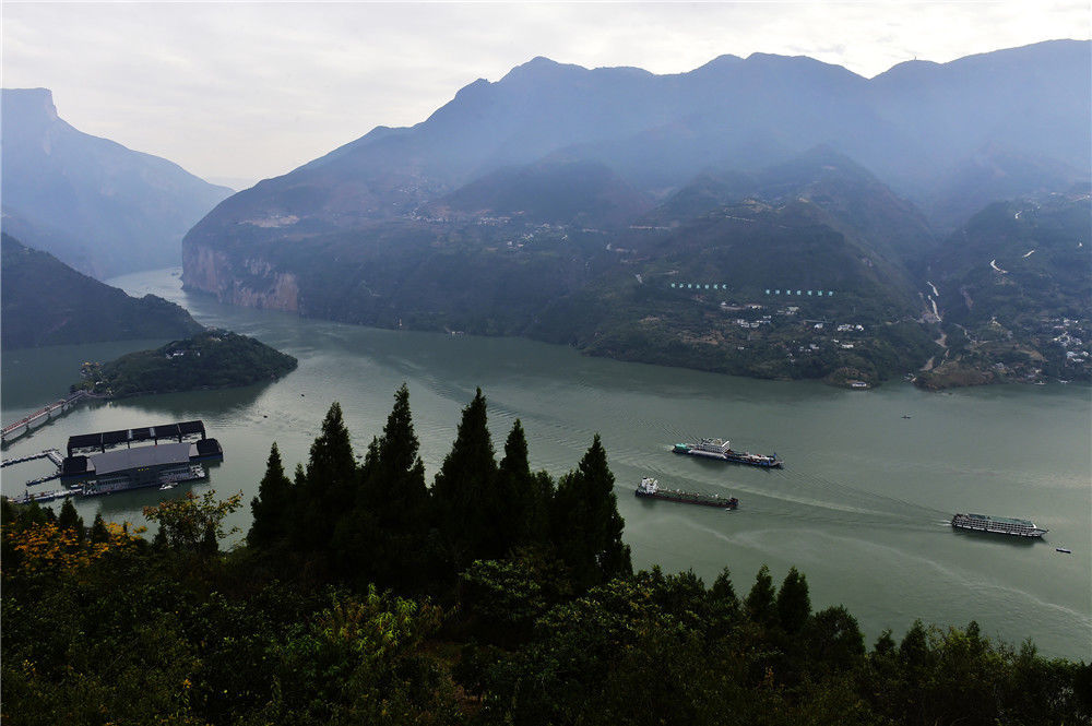 2019年11月2日,重慶,各種上行船舶正在通過白帝城前方的三峽夔門,蓄水后貨暢其流、往來無阻的水運業(yè)彰顯“黃金水道”的社會效益。