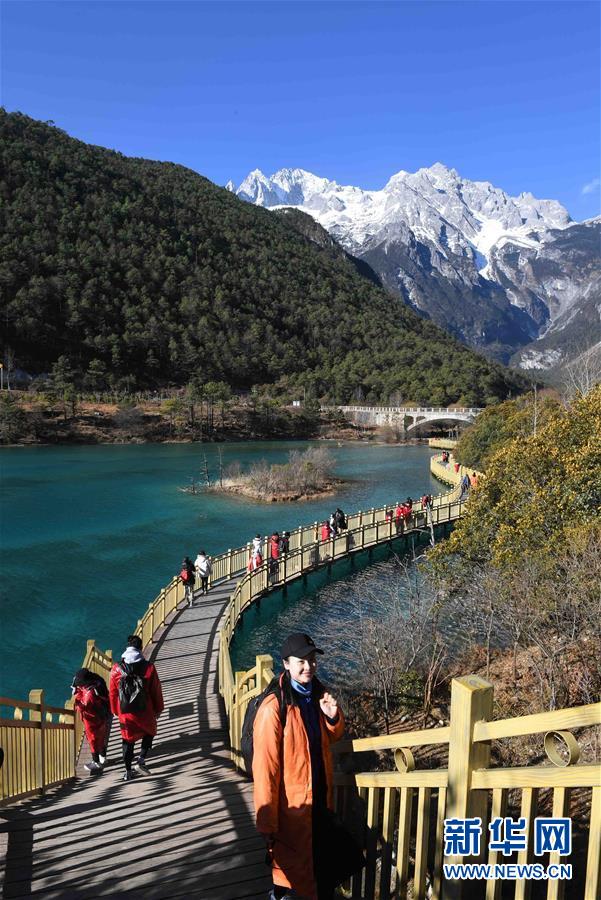 2月14日,游客在麗江玉龍雪山藍月谷游覽觀光。
