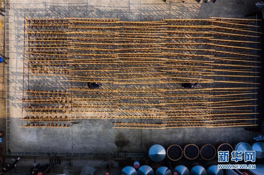 12月3日,安昌古鎮(zhèn)傳統(tǒng)臘味作坊里曬滿了各種手工制作的紹興臘味(無(wú)人機(jī)拍攝)。新華社記者徐昱攝