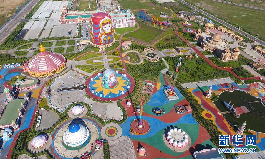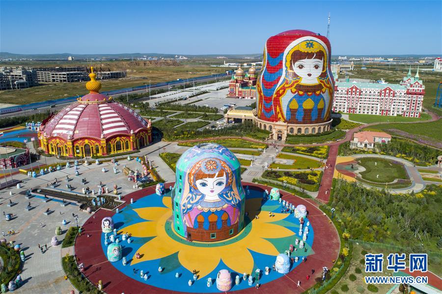 8月29日無人機(jī)拍攝的滿洲里市套娃廣場景區(qū)。滿洲里市位于呼倫貝爾大草原腹地。新華社記者彭源攝