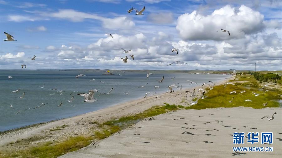 8月28日無人機(jī)拍攝的呼倫湖畔的水鳥。新華社記者沈伯韓攝