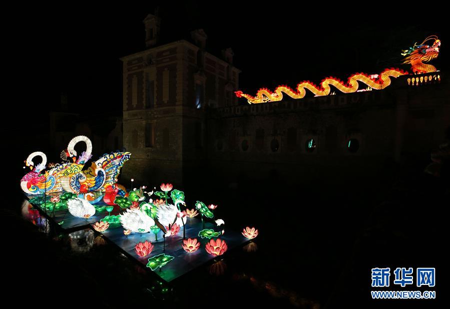 這是12月15日在法國謝爾河畔塞勒市的塞納古堡拍攝的中國彩燈。 新華社記者 高靜 攝
