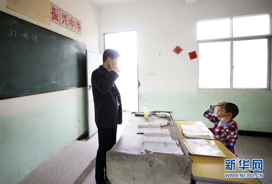 5月8日,王北海(左)在教室內為陳威宇講解“打電話”的流程。江西省瑞金市大柏地鄉(xiāng)三河小學坐落于大山深處。陳威宇是學校里唯一的學生。陳威宇今年9歲,家庭貧困,上學不便。為解決這一難題,當地政府決定恢復陳威宇家附近三河小學的辦學工作,今年46歲的王北海被安排為專職教師,從周一至周五,王北海幾乎每天24小時陪伴在陳威宇身旁,既當老師也當“家長”,照料他的學習和生活。新華社記者蘭紅光攝