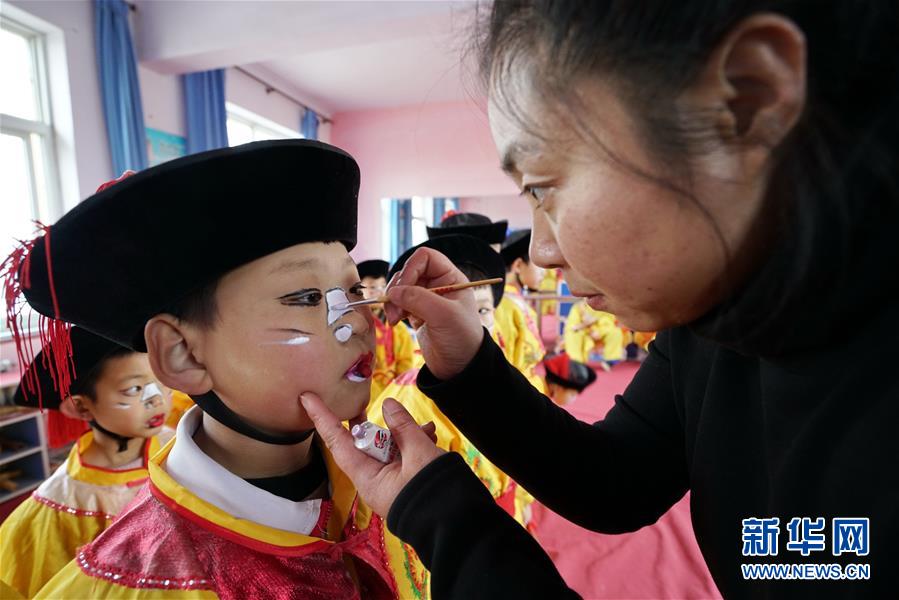 12月19日,河北省灤州市小閆營(yíng)小學(xué)教師在為排練地秧歌的學(xué)生化妝。新華社記者 牟宇 攝