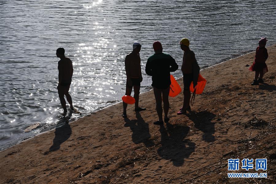 12月21日,冬泳愛好者準備進入黃河開始冬泳,一名身著冬裝的小女孩(右一)在一旁觀看。新華社記者陶希夷攝