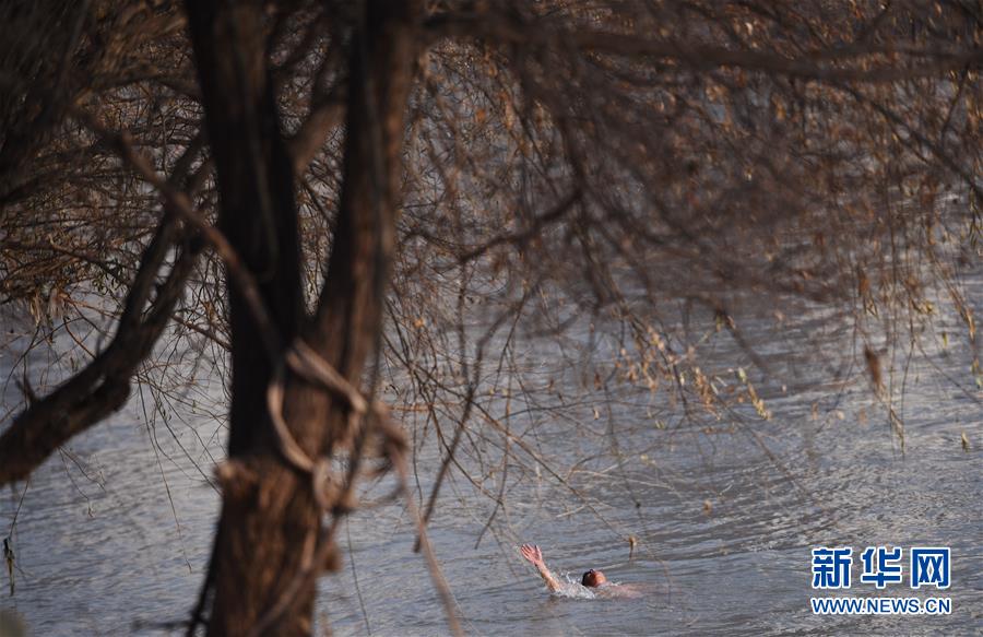 12月20日,83歲的冬泳愛好者周漢英在黃河冬泳。新華社記者陶希夷攝