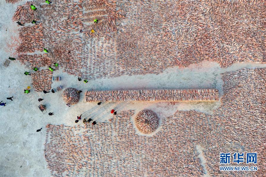 12月27日,在查干湖冰面上,工人將剛打撈上來的大魚扔上貨車。新華社記者張楠攝