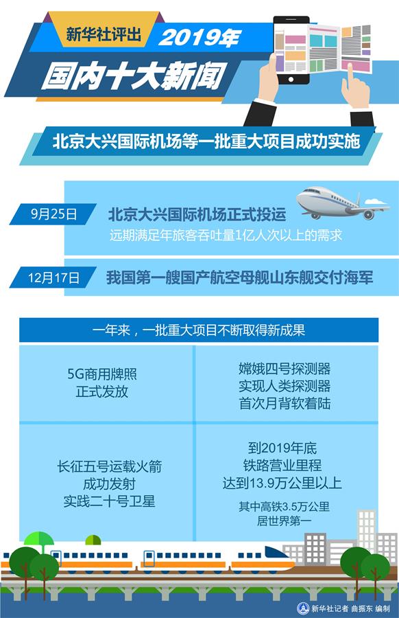 9月25日,北京大興國際機場正式投運,遠期滿足年旅客吞吐量1億人次以上的需求。12月17日,我國第一艘國產(chǎn)航空母艦山東艦交付海軍。一年來,一批重大項目不斷取得新成果:5G商用牌照正式發(fā)放;嫦娥四號探測器實現(xiàn)人類探測器首次月背軟著陸;長征五號運載火箭成功發(fā)射實踐二十號衛(wèi)星;到今年底,鐵路營業(yè)里程達到13.9萬公里以上,其中高鐵3.5萬公里,居世界第一。