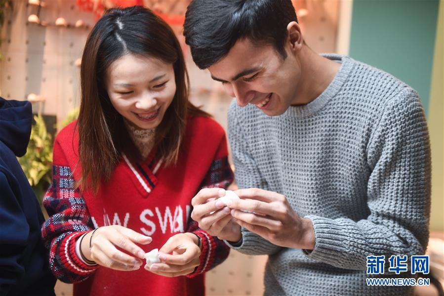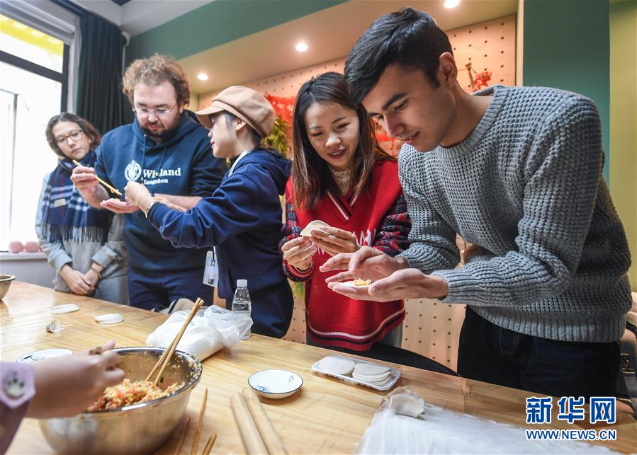 12月27日,中外青年在瓜山新苑社區(qū)活動中心參加迎新年活動,一起包餃子。新華社記者 徐昱 攝