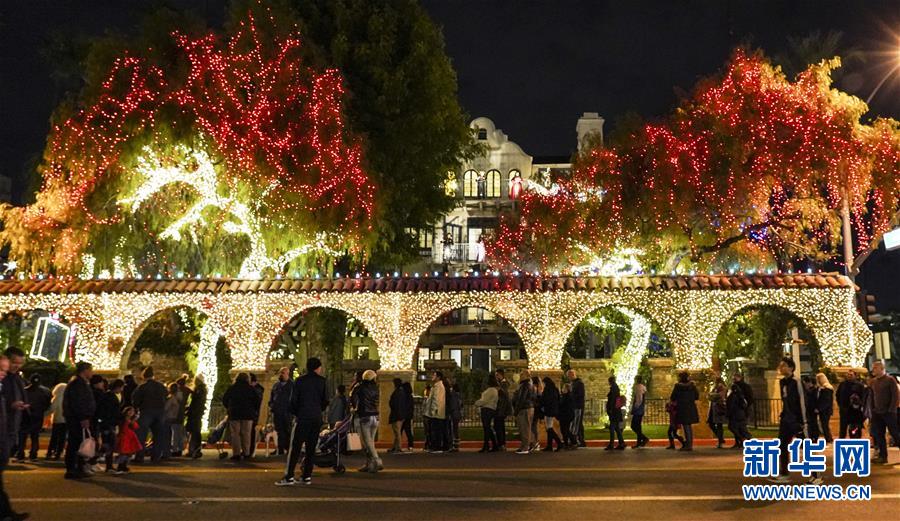 12月29日,人們?cè)诿绹?guó)加利福尼亞州里弗賽德燈光節(jié)上欣賞彩燈。第27屆里弗賽德燈光節(jié)流光璀璨,洋溢著濃厚的新年氣氛,吸引眾多游客前來(lái)觀看。 新華社記者李穎攝