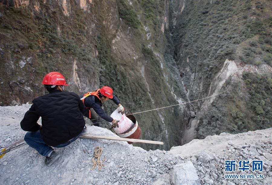 阿布洛哈村通村公路施工遇到陡崖夾溝地勢(shì),項(xiàng)目進(jìn)程艱難緩慢,四川路橋施工隊(duì)伍開始在峽谷兩邊分頭推進(jìn)(2019年11月20日攝)。新華社記者江宏景攝