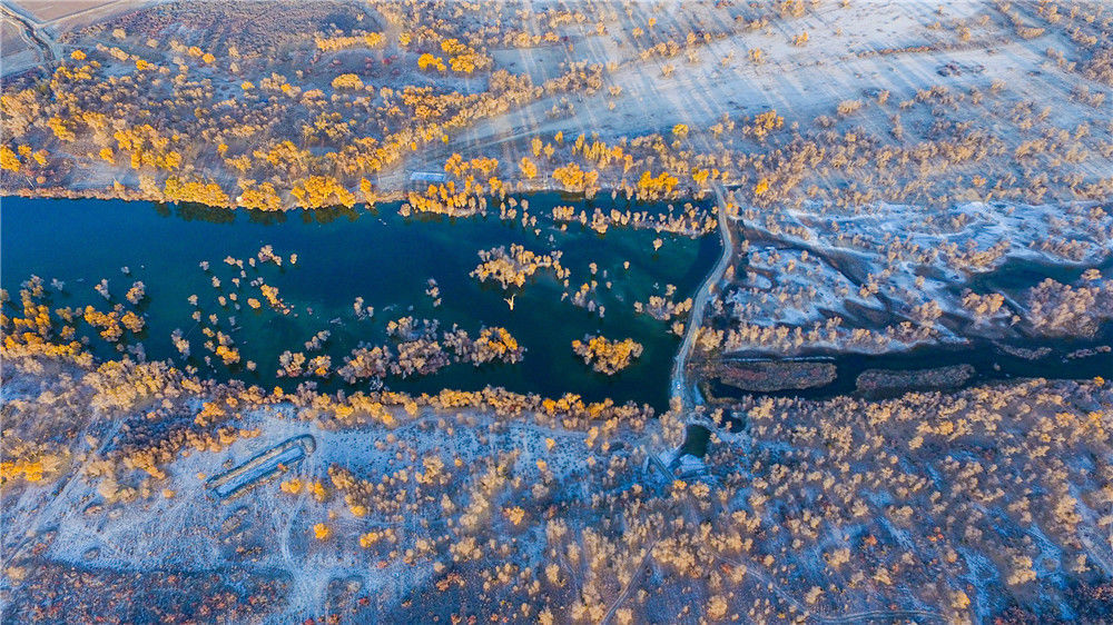 2019年11月12日,新疆阿克蘇,航拍塔里木河區(qū)域的金色胡楊林。袁歡歡/視覺中國