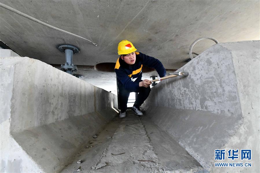 1月3日,中國鐵路濟南局臨沂工務(wù)段工程技術(shù)員畢雨佳在沂河特大橋箱梁內(nèi)檢查。新華社記者 朱崢攝