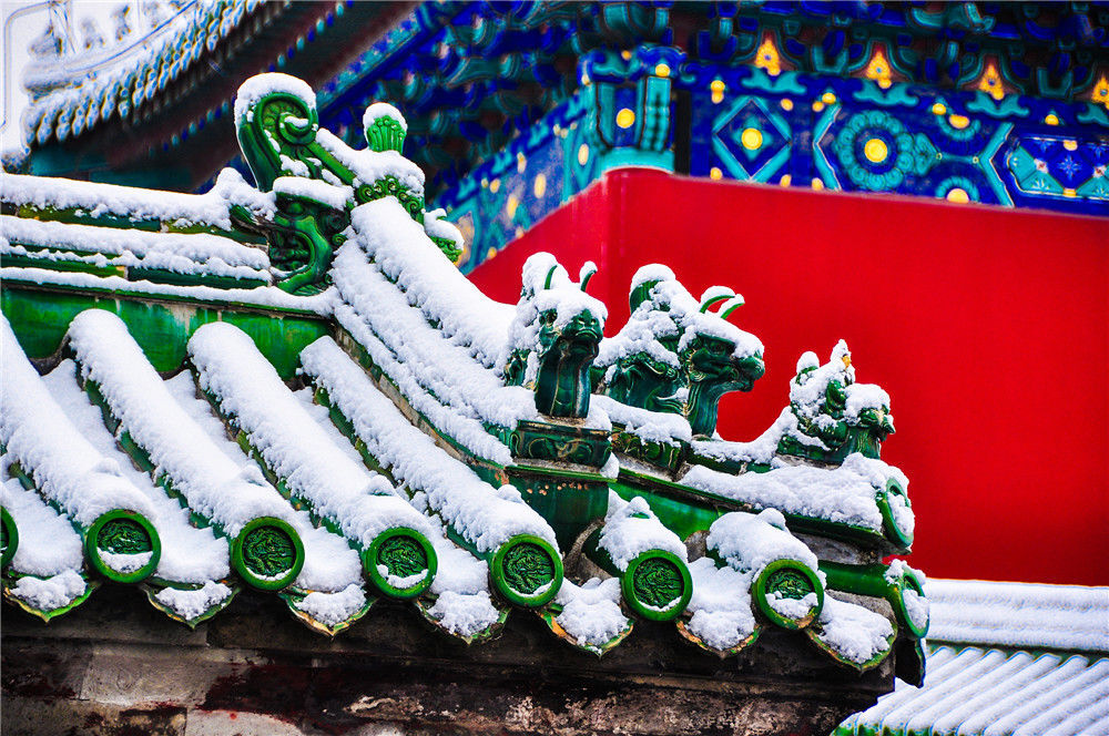 2019年11月30日,北京,初雪過(guò)后,天壇公園銀裝素裹,白雪古建相互映襯,景色迷人。時(shí)永平/千龍圖像/視覺(jué)中國(guó)