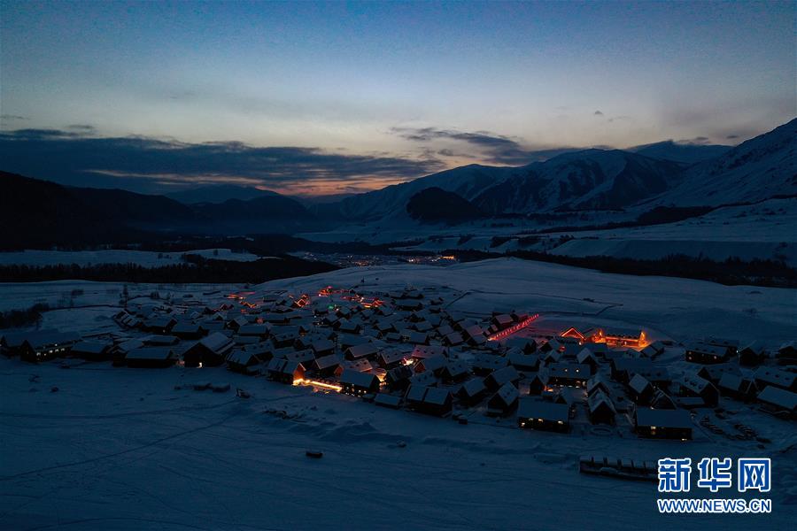 這是2019年12月31日拍攝的傍晚的禾木村(無人機(jī)照片)。 在新疆阿勒泰地區(qū)布爾津縣禾木村,不少游客選擇以觀光旅游的方式“別樣跨年”。游客們觀賞雪鄉(xiāng)風(fēng)景,體驗馬拉爬犁、騎馬等冬游項目,參加篝火狂歡、潑雪迎新年等慶?;顒?,冰天雪地?zé)崆椴粶p,別有一番風(fēng)情。 新華社記者 宋彥樺 攝