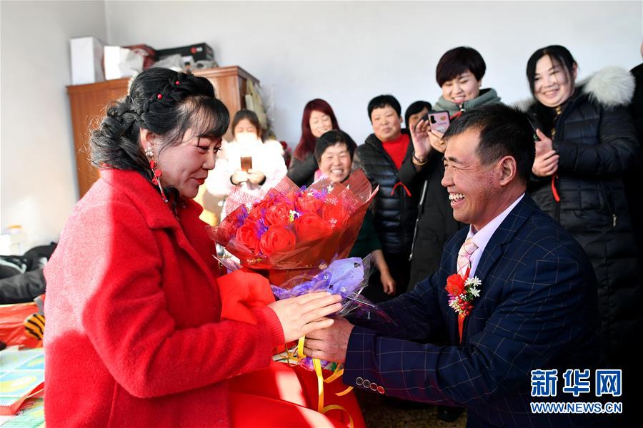 在和順縣李陽鎮(zhèn)南李陽村,新郎馬愛明將花送給新娘溫麗芳(2019年12月31日攝)。 農(nóng)歷臘月初六,是山西省和順縣李陽鎮(zhèn)下石勒村45歲的馬愛明娶媳婦的日子。 地處太行山區(qū)的下石勒村曾深陷貧困,“地下無資源、地上沒產(chǎn)業(yè)”是這里的真實寫照。2013年,村里638口人中有511口屬貧困人口。村民在貧瘠的坡地上種的玉米、谷子等僅夠糊口,外村女子都不愿嫁到這里。和村里多數(shù)人一樣,貧困戶馬愛明不得不在農(nóng)閑時出去打工補貼家用。東走走、西走走,馬愛明沒攢下錢,也沒遇見合適的人,婚事一拖再拖,成了大齡“光棍”。 2013年以來,在國家強(qiáng)有力的政策幫扶和基層黨組織的帶領(lǐng)下,下石勒村以合作社的形式發(fā)展起肉牛養(yǎng)殖、雙孢菇種植、萬壽菊種植等集體產(chǎn)業(yè)。下石勒村經(jīng)濟(jì)有了起色,外出打工的村民紛紛回村。馬愛明加入了村里的建筑隊,閑時還到種植專業(yè)合作社打工,一年四季都有活干。加上土地流轉(zhuǎn)的收入,馬愛明一年能收入三萬多元。2016年,下石勒村實現(xiàn)整村脫貧。 2019年,馬愛明結(jié)識了在下石勒村肉雞養(yǎng)殖專業(yè)合作社打工的李陽鎮(zhèn)南李陽村村民溫麗芳,馬愛明的樸實、善良、勤勞打動了溫麗芳,兩人擦出了愛情的火花。 臘月初六這天,下石勒村鑼鼓喧天,嗩吶齊鳴。在鄉(xiāng)親們的見證下,馬愛明手牽新娘,大聲宣布:“我脫單了!我的幸福生活開始了!” 新華社記者 詹彥 攝