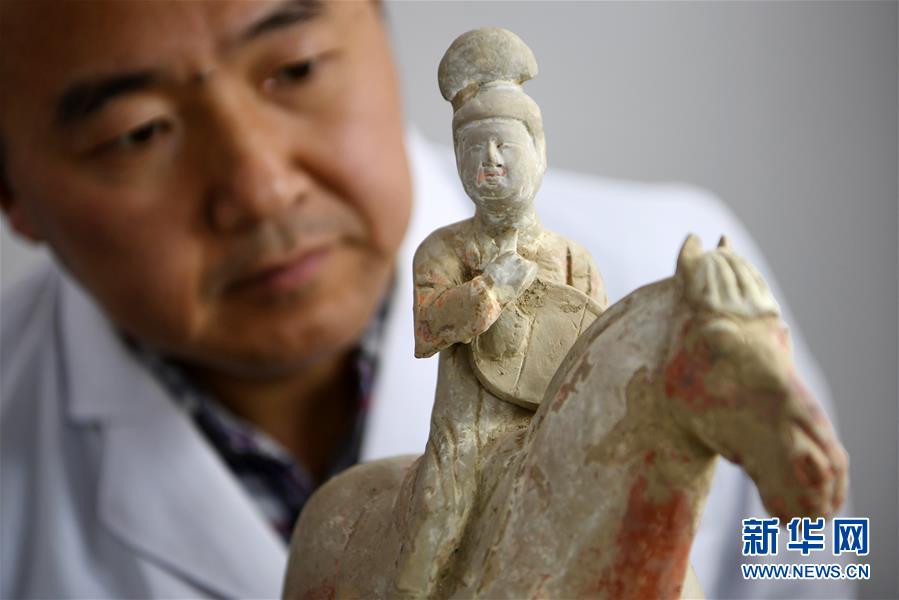 2019年12月27日,在天水市博物館文物保護(hù)修復(fù)中心陶、玉石器文物修復(fù)室,專業(yè)技術(shù)人員孟旭輝在觀察一件唐代彩繪陶俑的病害情況。 甘肅省天水市博物館文物保護(hù)修復(fù)中心有一支專業(yè)的文物修復(fù)隊伍,共有14名專業(yè)技術(shù)人員。從2012年正式成立以來,他們不僅承擔(dān)著對館藏和館外文物的修復(fù)工作,還參與了多次文化遺存的調(diào)查和搶救性發(fā)掘、古建筑彩畫保護(hù)、古墓葬搬遷復(fù)原等工作。一件件殘缺破損、滿身病害的文物經(jīng)過他們的巧手修復(fù),又重新煥發(fā)光彩,展示在公眾面前。 新華社記者 馬寧 攝