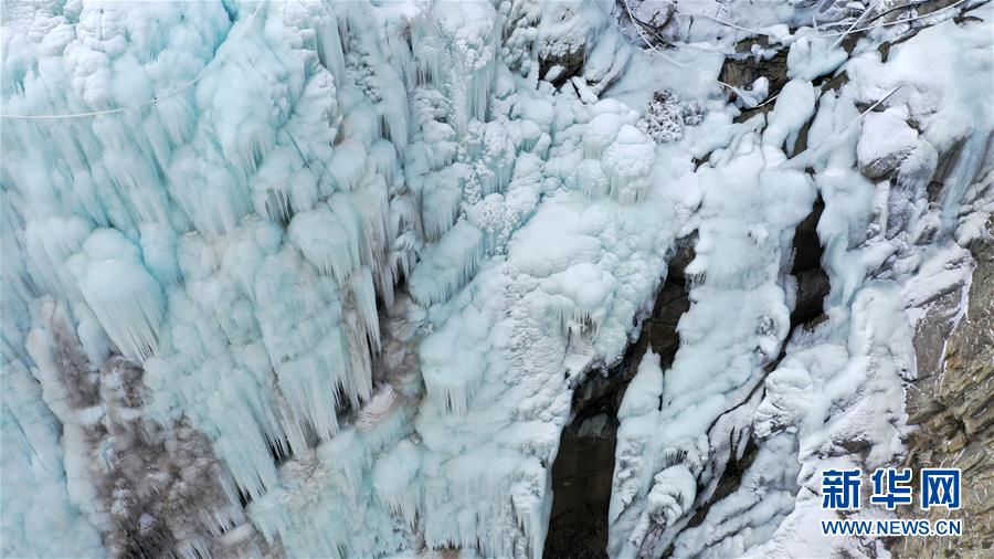 這是1月7日拍攝的賀蘭山巖畫(huà)景區(qū)內(nèi)的冰瀑景觀(無(wú)人機(jī)照片)。 新華社記者 王鵬 攝
