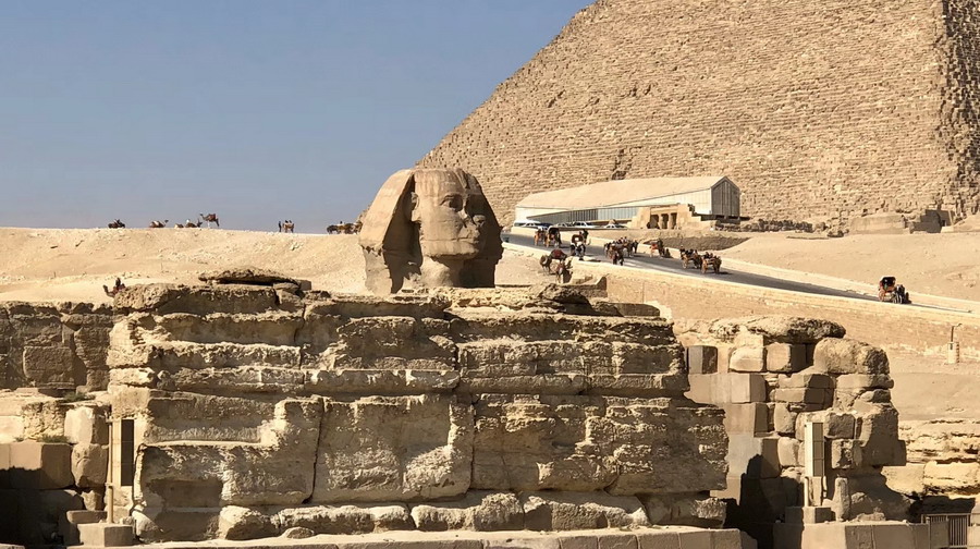 此像高20米,長(zhǎng)57米,算上兩個(gè)前爪,全長(zhǎng)72米。它頭戴“奈姆斯”皇冠,兩耳側(cè)有扇狀的“那姆斯”頭巾下垂,前額上刻著圣蛇浮雕,下頜有帝王的標(biāo)志,下垂的長(zhǎng)須,脖子上圍著項(xiàng)圈,鷹的羽毛圖案打扮著獅身。孫衛(wèi)南攝