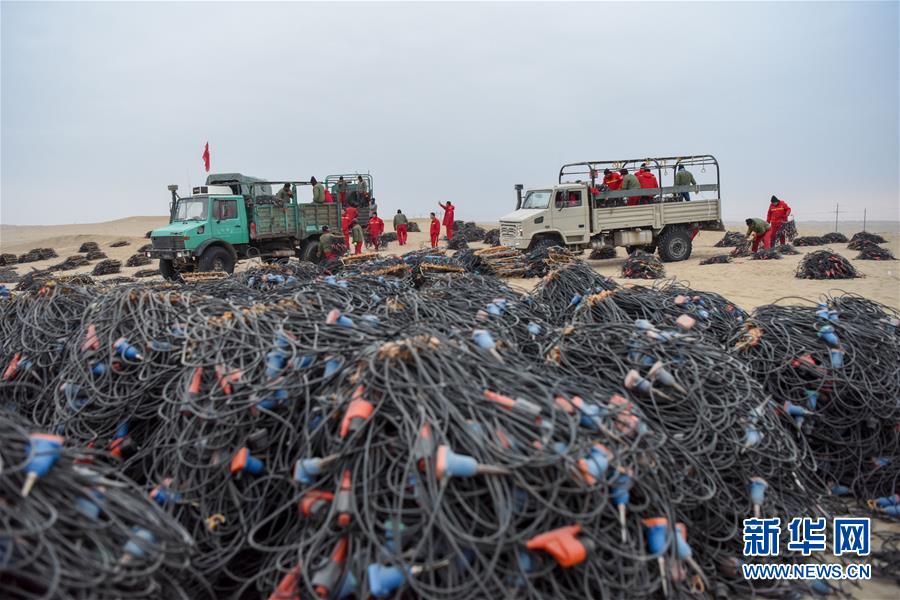 1月14日,放線工在出工前將一捆捆檢波器裝車。地球物理勘探是油氣開發(fā)的第一步,相當于給地球做CT。物探工人按照嚴格的測線部署,在相應位置鉆井,然后實施地震,采集地震波數(shù)據(jù)??蒲腥藛T通過數(shù)據(jù)組成的“CT片”,就能夠清晰地“看”到地下的地質(zhì)結(jié)構(gòu),判斷哪里埋藏有石油或者天然氣。2019年10月,東方地球物理勘探有限責任公司塔里木物探處2113隊進入新疆塔克拉瑪干沙漠腹地,開始中古14-21、塔中2兩個區(qū)塊的三維地震勘探。近2000名物探工人將在1000平方公里的范圍內(nèi)一直工作到2020年4月,這也意味著他們將在塔克拉瑪干沙漠腹地連續(xù)度過第14個除夕夜。蘊藏著豐富石油天然氣資源的新疆塔克拉瑪干沙漠有“死亡之?!敝Q,氣候干燥,年降水量在50毫米以下,冬季地表最低溫度超過零下30攝氏度,是世界油氣勘探難度最大的地區(qū)之一。為避開風季,物探工人每年9、10月份進入沙漠,一直工作到來年4月,夜以繼日與黃沙、嚴寒為伴,用辛勤的汗水,為祖國找油找氣。新華社記者丁磊攝
