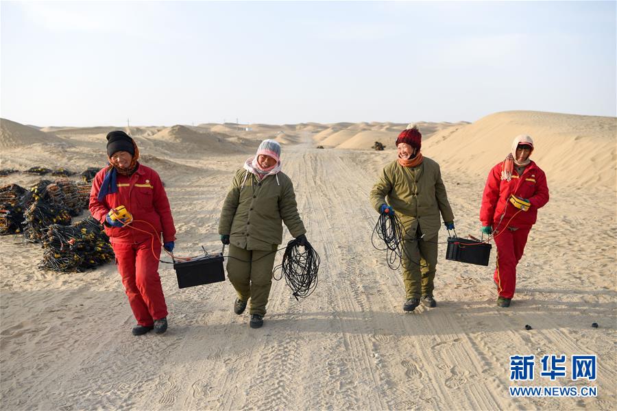 1月14日,4名測線女工抬著電瓶返回營地。地球物理勘探是油氣開發(fā)的第一步,相當于給地球做CT。物探工人按照嚴格的測線部署,在相應位置鉆井,然后實施地震,采集地震波數(shù)據(jù)。科研人員通過數(shù)據(jù)組成的“CT片”,就能夠清晰地“看”到地下的地質(zhì)結(jié)構(gòu),判斷哪里埋藏有石油或者天然氣。2019年10月,東方地球物理勘探有限責任公司塔里木物探處2113隊進入新疆塔克拉瑪干沙漠腹地,開始中古14-21、塔中2兩個區(qū)塊的三維地震勘探。近2000名物探工人將在1000平方公里的范圍內(nèi)一直工作到2020年4月,這也意味著他們將在塔克拉瑪干沙漠腹地連續(xù)度過第14個除夕夜。蘊藏著豐富石油天然氣資源的新疆塔克拉瑪干沙漠有“死亡之海”之稱,氣候干燥,年降水量在50毫米以下,冬季地表最低溫度超過零下30攝氏度,是世界油氣勘探難度最大的地區(qū)之一。為避開風季,物探工人每年9、10月份進入沙漠,一直工作到來年4月,夜以繼日與黃沙、嚴寒為伴,用辛勤的汗水,為祖國找油找氣。新華社記者丁磊攝