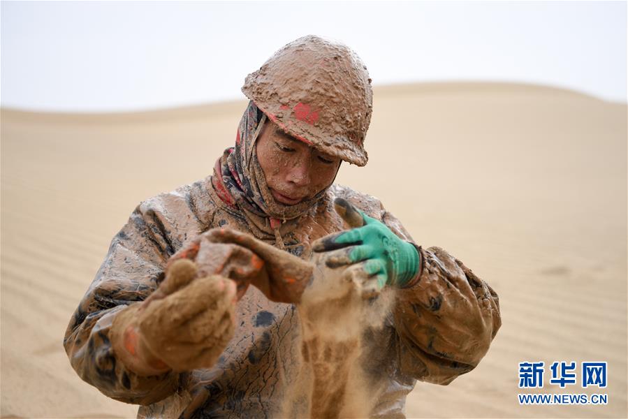 1月13日,鉆井工潘洪星用沙子帶出手套里的泥水。地球物理勘探是油氣開發(fā)的第一步,相當于給地球做CT。物探工人按照嚴格的測線部署,在相應位置鉆井,然后實施地震,采集地震波數(shù)據(jù)??蒲腥藛T通過數(shù)據(jù)組成的“CT片”,就能夠清晰地“看”到地下的地質(zhì)結(jié)構(gòu),判斷哪里埋藏有石油或者天然氣。2019年10月,東方地球物理勘探有限責任公司塔里木物探處2113隊進入新疆塔克拉瑪干沙漠腹地,開始中古14-21、塔中2兩個區(qū)塊的三維地震勘探。近2000名物探工人將在1000平方公里的范圍內(nèi)一直工作到2020年4月,這也意味著他們將在塔克拉瑪干沙漠腹地連續(xù)度過第14個除夕夜。蘊藏著豐富石油天然氣資源的新疆塔克拉瑪干沙漠有“死亡之?!敝Q,氣候干燥,年降水量在50毫米以下,冬季地表最低溫度超過零下30攝氏度,是世界油氣勘探難度最大的地區(qū)之一。為避開風季,物探工人每年9、10月份進入沙漠,一直工作到來年4月,夜以繼日與黃沙、嚴寒為伴,用辛勤的汗水,為祖國找油找氣。新華社記者丁磊攝
