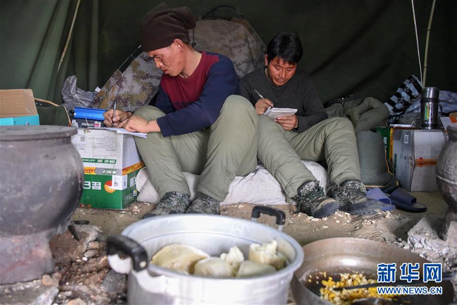1月14日,查線工在吃飯間隙收聽電臺里報出的不正常道樁號,并記錄在本子上。地球物理勘探是油氣開發(fā)的第一步,相當于給地球做CT。物探工人按照嚴格的測線部署,在相應位置鉆井,然后實施地震,采集地震波數(shù)據(jù)??蒲腥藛T通過數(shù)據(jù)組成的“CT片”,就能夠清晰地“看”到地下的地質(zhì)結(jié)構(gòu),判斷哪里埋藏有石油或者天然氣。2019年10月,東方地球物理勘探有限責任公司塔里木物探處2113隊進入新疆塔克拉瑪干沙漠腹地,開始中古14-21、塔中2兩個區(qū)塊的三維地震勘探。近2000名物探工人將在1000平方公里的范圍內(nèi)一直工作到2020年4月,這也意味著他們將在塔克拉瑪干沙漠腹地連續(xù)度過第14個除夕夜。蘊藏著豐富石油天然氣資源的新疆塔克拉瑪干沙漠有“死亡之海”之稱,氣候干燥,年降水量在50毫米以下,冬季地表最低溫度超過零下30攝氏度,是世界油氣勘探難度最大的地區(qū)之一。為避開風季,物探工人每年9、10月份進入沙漠,一直工作到來年4月,夜以繼日與黃沙、嚴寒為伴,用辛勤的汗水,為祖國找油找氣。新華社記者丁磊攝