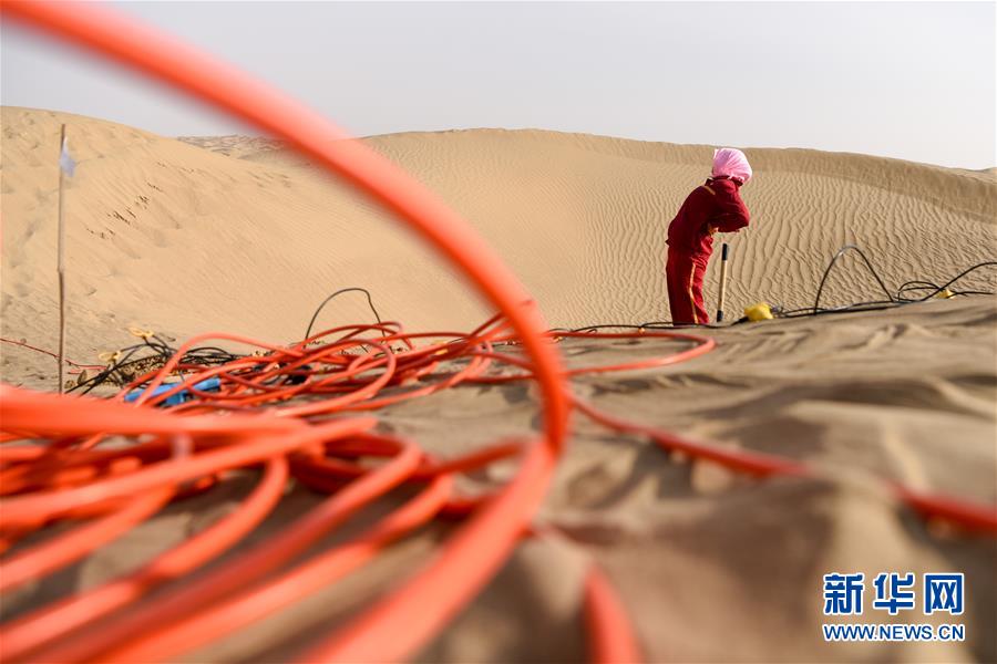 1月13日,測量工在測線上布設(shè)炮點樁號。地球物理勘探是油氣開發(fā)的第一步,相當于給地球做CT。物探工人按照嚴格的測線部署,在相應位置鉆井,然后實施地震,采集地震波數(shù)據(jù)。科研人員通過數(shù)據(jù)組成的“CT片”,就能夠清晰地“看”到地下的地質(zhì)結(jié)構(gòu),判斷哪里埋藏有石油或者天然氣。2019年10月,東方地球物理勘探有限責任公司塔里木物探處2113隊進入新疆塔克拉瑪干沙漠腹地,開始中古14-21、塔中2兩個區(qū)塊的三維地震勘探。近2000名物探工人將在1000平方公里的范圍內(nèi)一直工作到2020年4月,這也意味著他們將在塔克拉瑪干沙漠腹地連續(xù)度過第14個除夕夜。蘊藏著豐富石油天然氣資源的新疆塔克拉瑪干沙漠有“死亡之?!敝Q,氣候干燥,年降水量在50毫米以下,冬季地表最低溫度超過零下30攝氏度,是世界油氣勘探難度最大的地區(qū)之一。為避開風季,物探工人每年9、10月份進入沙漠,一直工作到來年4月,夜以繼日與黃沙、嚴寒為伴,用辛勤的汗水,為祖國找油找氣。新華社記者丁磊攝