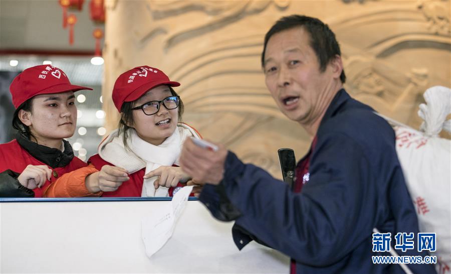 1月14日,在西安北站候車大廳,青年志愿者在為旅客服務。路再遠、再艱辛,也擋不住回家的腳步。在西安北站的每一個角落,處處充滿溫情和歸鄉(xiāng)的盼望。連日來,西安北站日均發(fā)送旅客12.1萬人次,一列列春運的列車,載著中國人的鄉(xiāng)愁,駛向遠方。新華社記者陶明攝