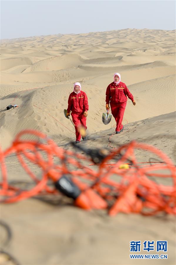 放線工張進秀(右)和陳莉云翻越沙丘進行放線工作(1月14日攝)。新華社記者 丁磊 攝