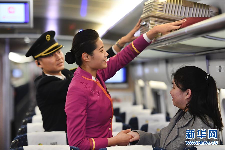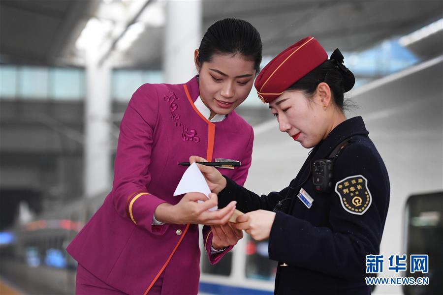 吉如(左)將盲人旅客吳瀟護(hù)送上車后,與列車長(zhǎng)進(jìn)行交接(1月15日攝)。 新華社記者 陶明 攝