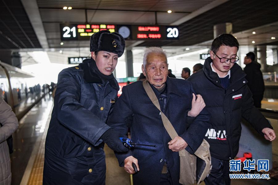 吉如(前右)護(hù)送盲人姑娘吳瀟上車(1月15日攝)。 新華社記者 陶明 攝