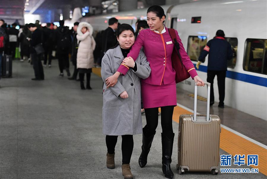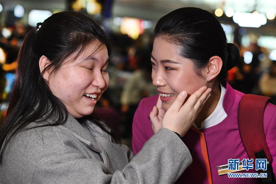 盲人姑娘吳瀟(左)從西安北站中轉(zhuǎn)回延安老家,得到吉如的溫馨服務(wù)。臨別時(shí),吳瀟激動(dòng)地說:“小姐姐,你的服務(wù)太貼心了,我看不見你,能摸摸你的臉頰嗎?”(1月15日攝)。 新華社記者 陶明 攝