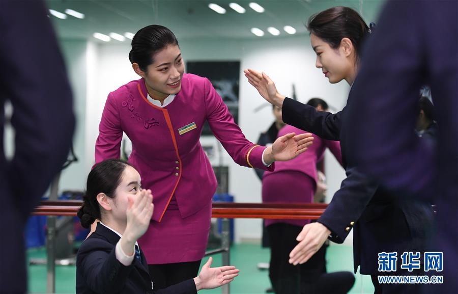 吉如(后左一)在車站職工活動(dòng)室指導(dǎo)同事禮儀訓(xùn)練(1月15日攝)。 新華社記者 陶明 攝