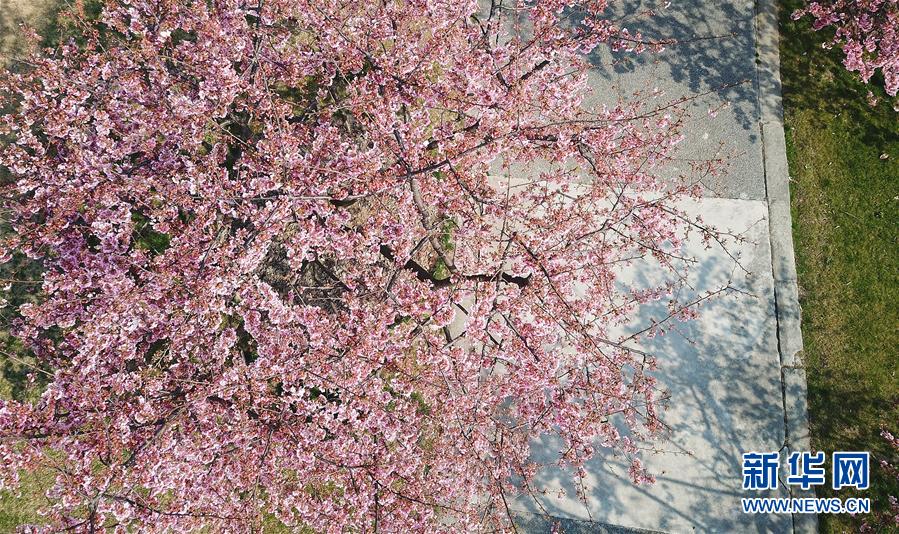 這是2月24日在上海松江辰山植物園內拍攝的河津櫻(無人機照片)。 新華社記者 方喆 攝