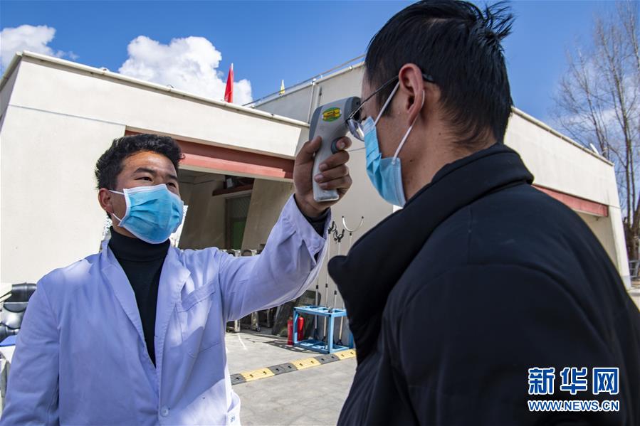 西藏大學(xué)醫(yī)學(xué)院預(yù)防專(zhuān)業(yè)本科生次成郎加(左)在學(xué)校門(mén)口為來(lái)校者測(cè)量體溫(2月23日攝)。新華社記者孫非攝