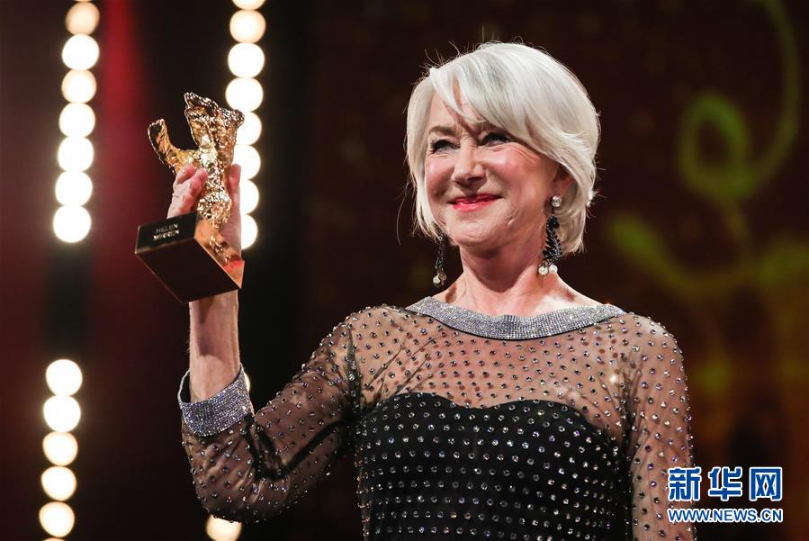 2月27日,在德國(guó)首都柏林,英國(guó)演員海倫·米倫在頒獎(jiǎng)儀式上捧起獎(jiǎng)杯。新華社記者單宇琦攝