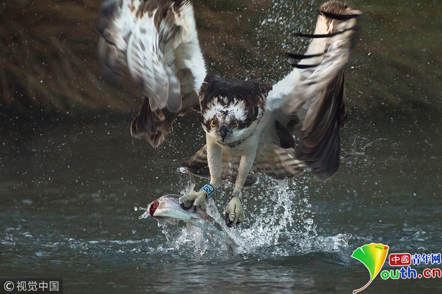 一只魚(yú)鷹潛入湖中捉鱒魚(yú),激起巨大的水花。圖片作者/視覺(jué)中國(guó)