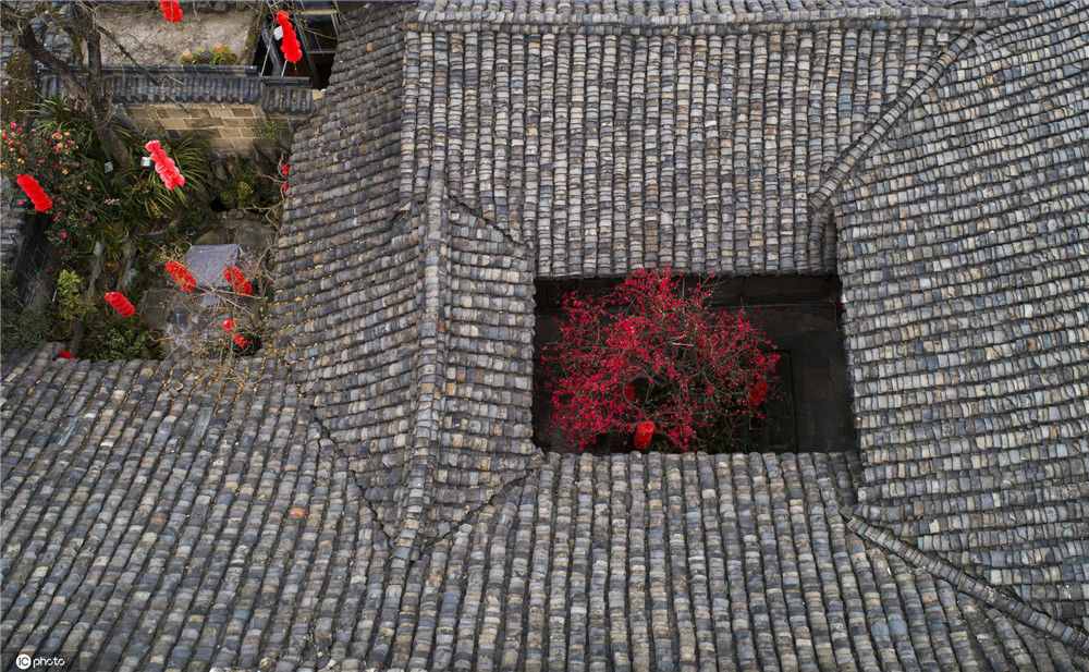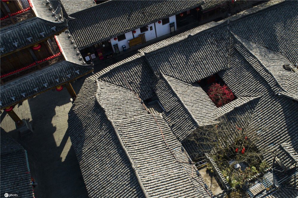 2020年2月21日,四川南充閬中古城中天樓旁,張家小院天井中的海棠在陽光中綻放(無人機(jī)拍攝)。