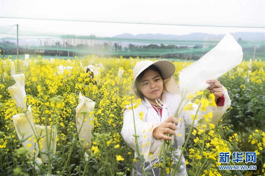 3月5日,工人在重慶市油菜工程技術研究中心油菜試驗田內(nèi)給油菜花套袋。時下正值油菜花期,重慶市油菜工程技術研究中心的農(nóng)學專家?guī)ьI學生和技術工人搶抓農(nóng)時,推進油菜科研和育種工作。新華社記者 王全超 攝
