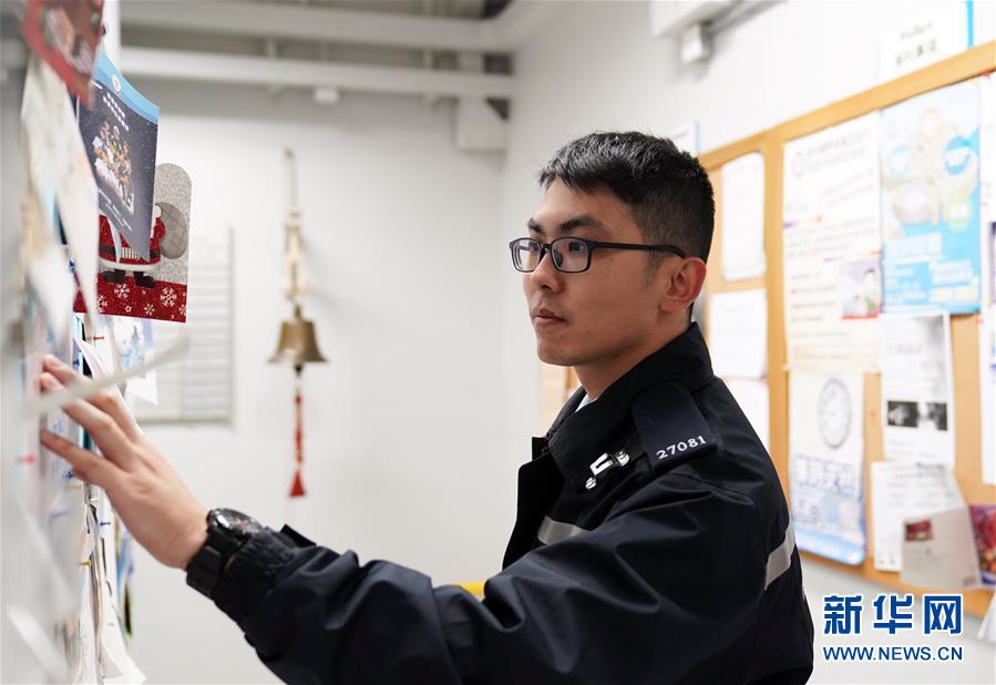 香港西區(qū)警署第三梯隊(duì)成員李Sir瀏覽市民寄來(lái)的心意卡(1月27日攝)。新華社記者李鋼攝