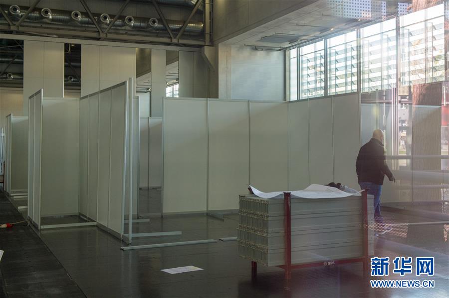 3月14日,在即將改造成為方艙醫(yī)院的維也納展覽館內(nèi),工作人員正在加緊施工。新華社記者郭晨攝