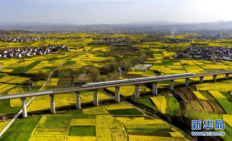 3月14日,一列動(dòng)車從洋縣油菜花海中駛過(無人機(jī)照片)。近日,秦嶺南麓的陜西省漢中市洋縣14萬畝油菜花競(jìng)相開放,美景如畫。新華社記者陶明攝