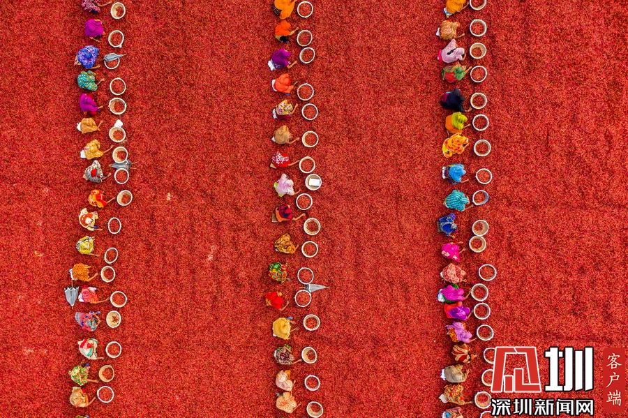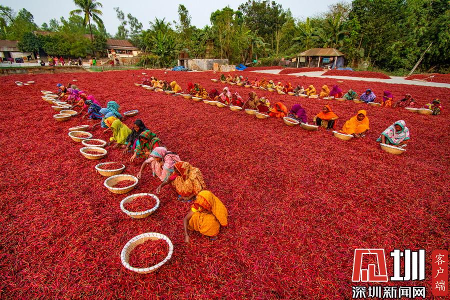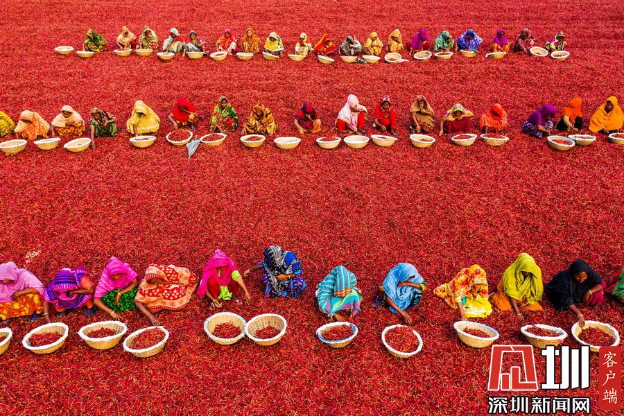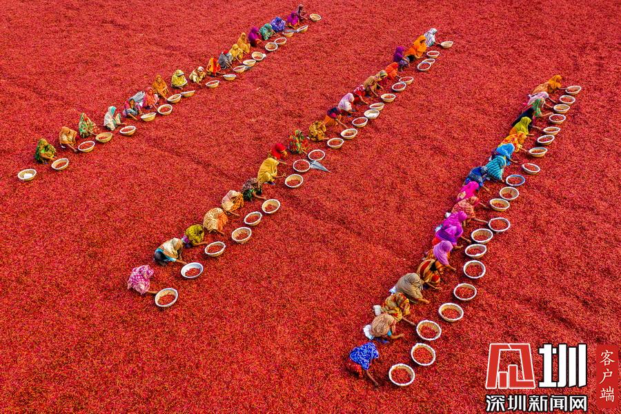 孟加拉國伯格拉,航拍穿著五顏六色衣服的工人們排列整齊的分揀辣椒。